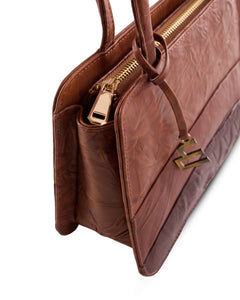 Our asymmetrical leather shoulder bag in a multicolored brown print